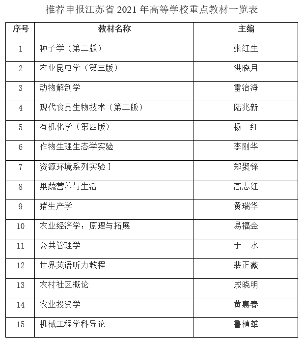 根据江苏省高等教育学会《关于做好2021年高等学校重点教材立项建设工作的通知》(苏高教会〔2021〕27号)文件要求,经学院申报,专家评审,拟定推荐《种子学》等15部教材,具体名单详见下表,公示时间为5天,如有异议,请具名于9月18日前向教务处专业与课程教材建设科反映。