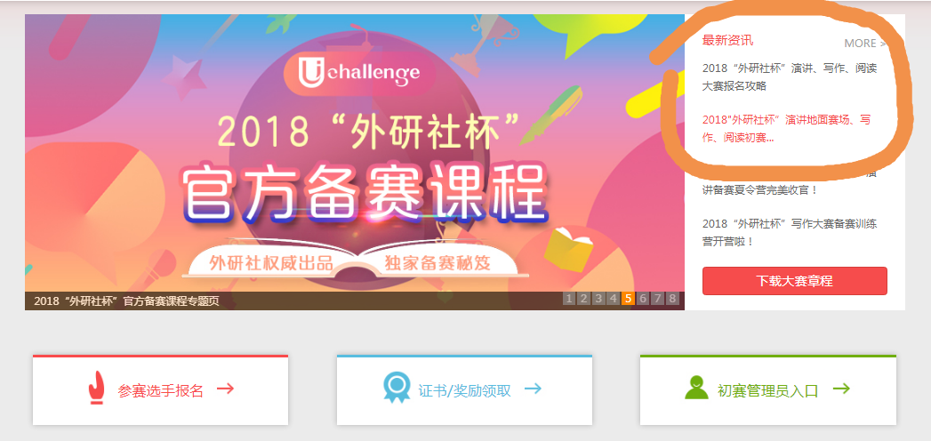 a. 线上报名:请有意参赛的同学登陆大赛官网http://uchallenge.unipus.cn/,并仔细阅读网页右上方的2018“外研社杯”演讲、写作、阅读大赛报名攻略(见下图圈出部分)进行网上报名。
