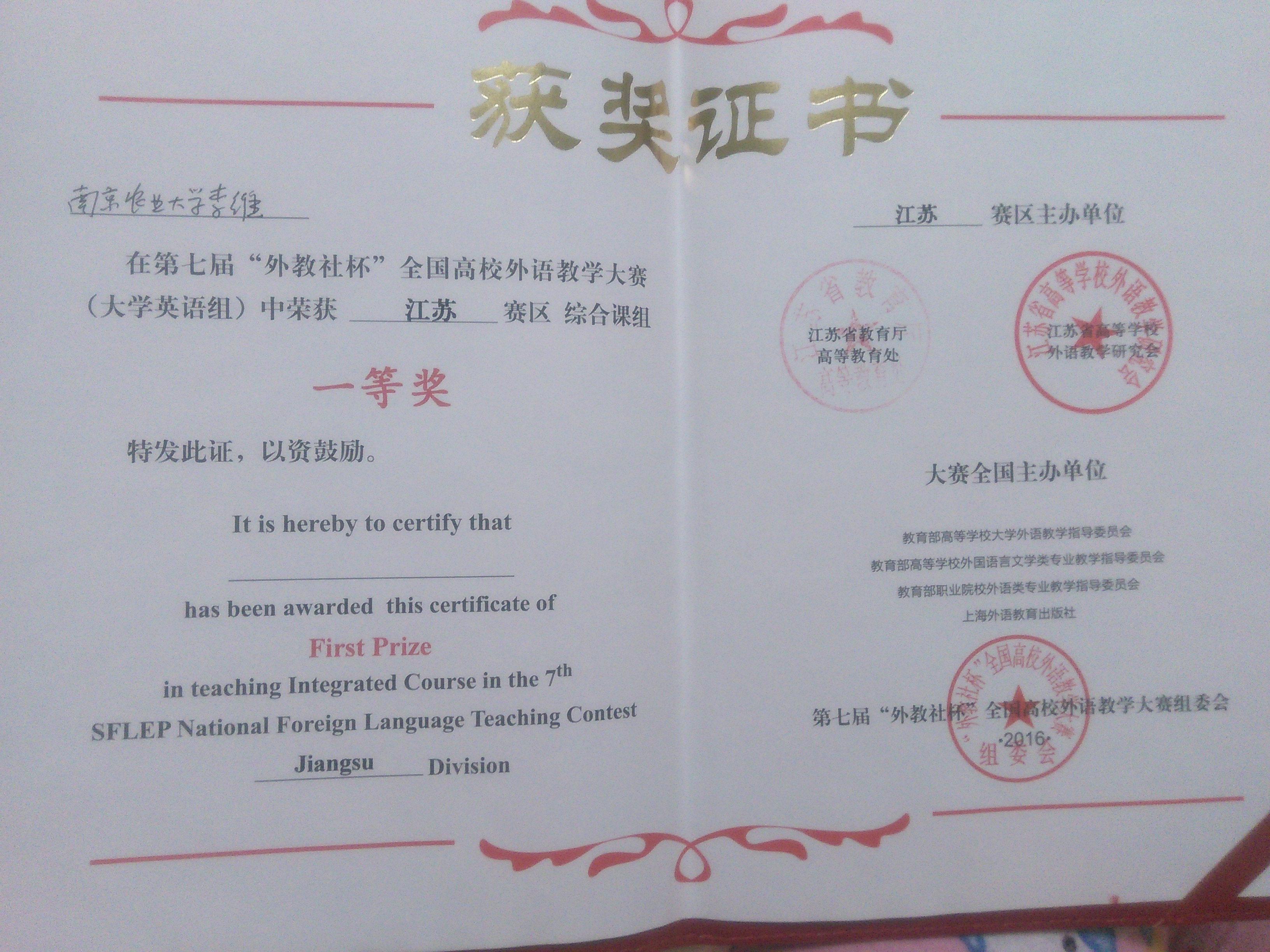 5月29日,由江苏省教育厅高等教育处、江苏省高等学校外语教学研究会和上海外语教育出版社联合举办的第七届“外教社”杯全国高校外语教学大赛在扬州大学落幕。我校外国语学院的李维老师通过初赛、复赛最后进入决赛。在决赛中与其他十一位来自全省其它高校的优秀教师同场竞技。比赛包括现场授课、即兴说课以及现场提问等环节,李维老师在比赛中展现了强劲的实力,最后荣获综合组一等奖,充分展示我了校老师较高的外语教学水平。