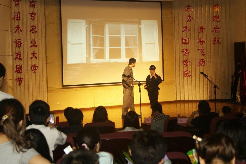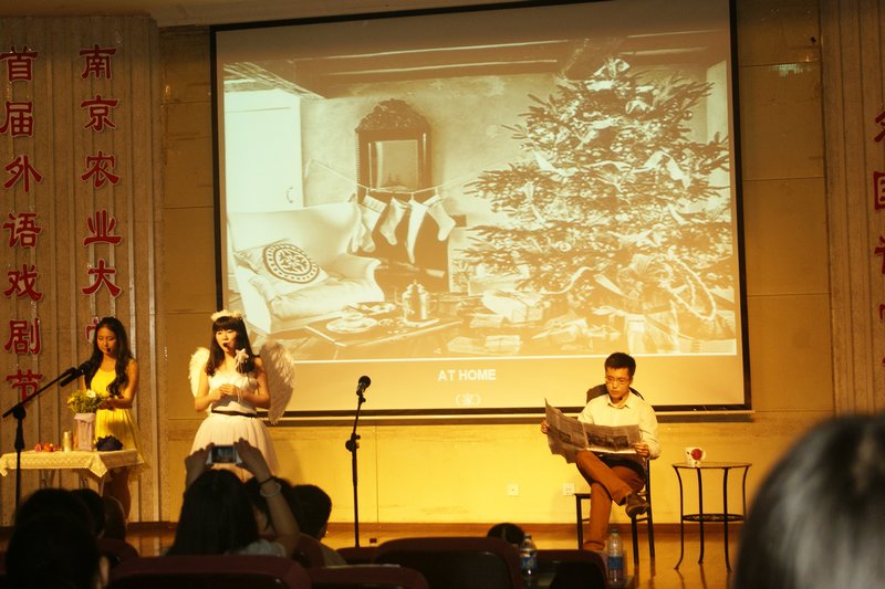 首届外语戏剧节汇报演出在图书馆报告厅拉开帷幕。经过两个月的精心准备,来自外国语学院英语和日语专业以及全校其他专业的一、二年级学生代表为观众们奉献了精彩的《警察与赞美诗》、《白雪公主》、《雷雨》等五部英语短剧以及《笑神降临之天气姐姐》等两部日语短剧。教务处副处长高务龙、外国语学院副院长王宏林及部分教师代表、国际处和国际教育学院部分师生、以及园艺学院辅导员等出席了此次活动。此次活动由外国语学院主办,外国语学院团委承办。