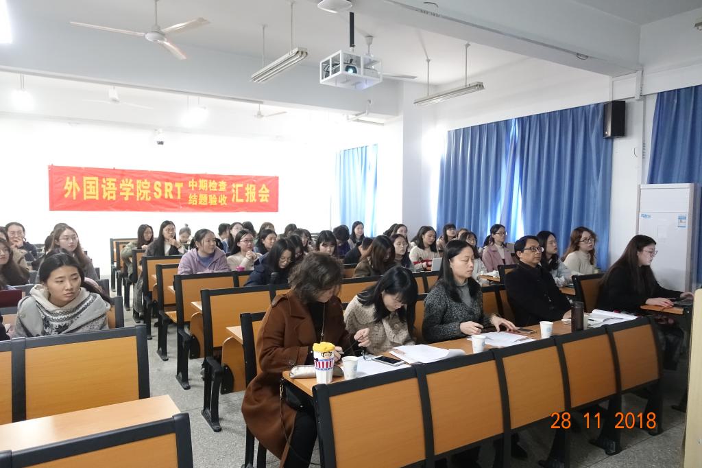 2018年11月28日下午,外国语学院在教学楼A525和A528举行了SRT项目中期检查的汇报会。汇报分成英语组和日语组同时进行。英语组由李平、裴正薇、樊淑英以及张萍四位老师担任评委,日语组则由卢冬丽、金锦珠、武锐以及王薇四位老师担任评委。每位评委老师都对各个项目组的展示内容提出了自己建议,并对后续研究的开展表现了期待。