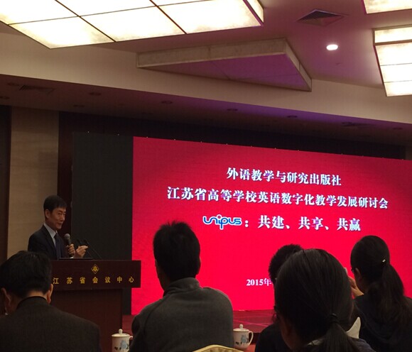 1月10日上午,外国语学院游衣明副院长、王银泉副院长、曹新宇副院长、公外部主任顾飞荣和主任助理王菊芳一行赴江苏省会议中心出席了由外语教学与研究出版社举办的“江苏省高等学校英语数字化教学发展研讨会”。会议主题是探讨数字化外语教学系统使用与管理。外研社总编辑徐建中和Unipus江苏区域主管张舒分别介绍了“数字化校园”(Unipus)的起源、理念、设计、应用及其对适应时代召唤的大学英语教学改革的重大创新意义。扬州大学、江南大学、南京审计学院及南京航空航天大学金城学院的代表分别介绍了他们先行进行大学英语教学改革、使用Unipus创新教学模式和方法、提高英语教学效率和效果的经验和进一步研究的空间。